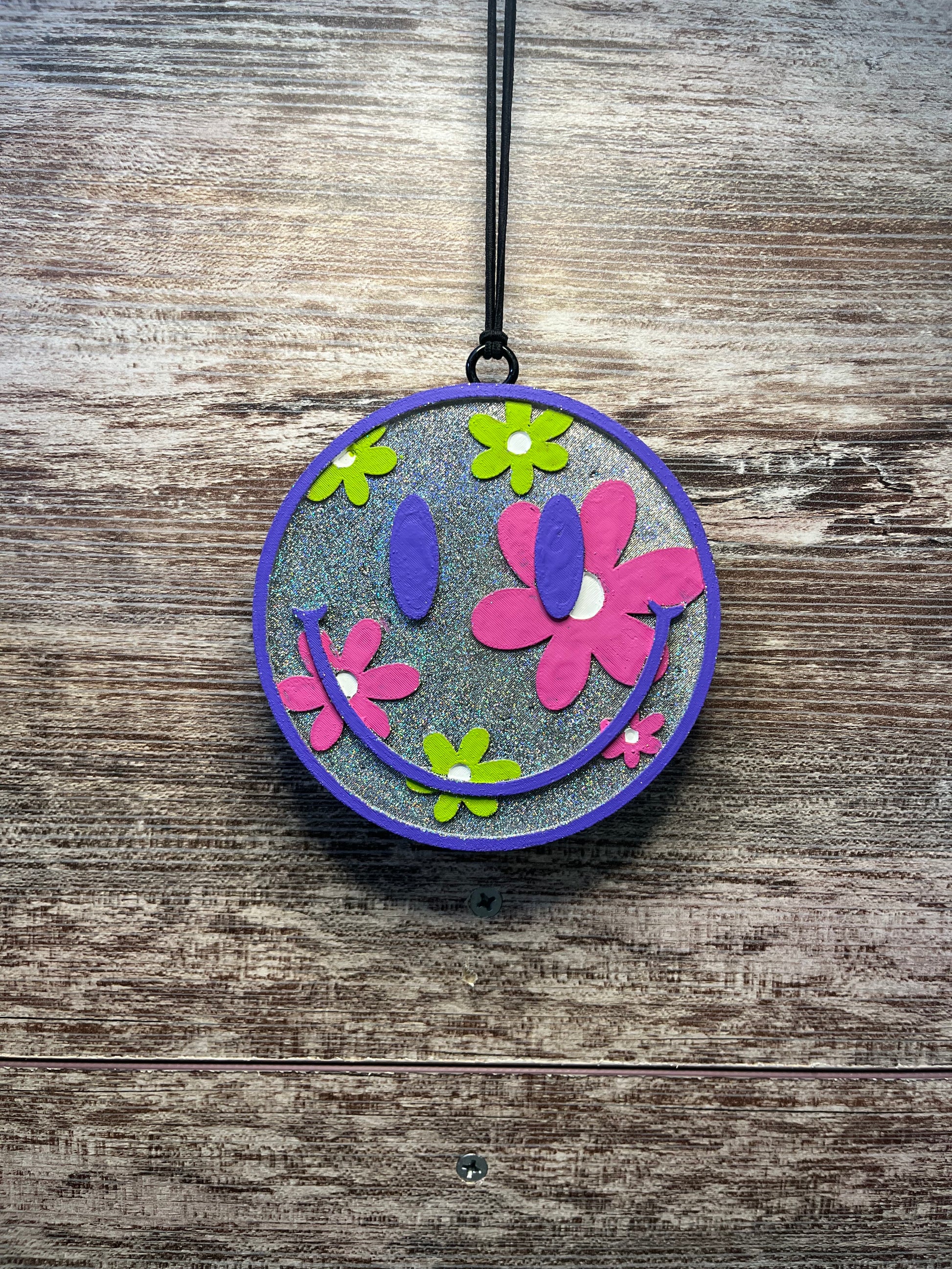 Upgrade your ride with a fun, floral twist—shop the Floral Silver Smiley Car Freshie today and drive happy every day.